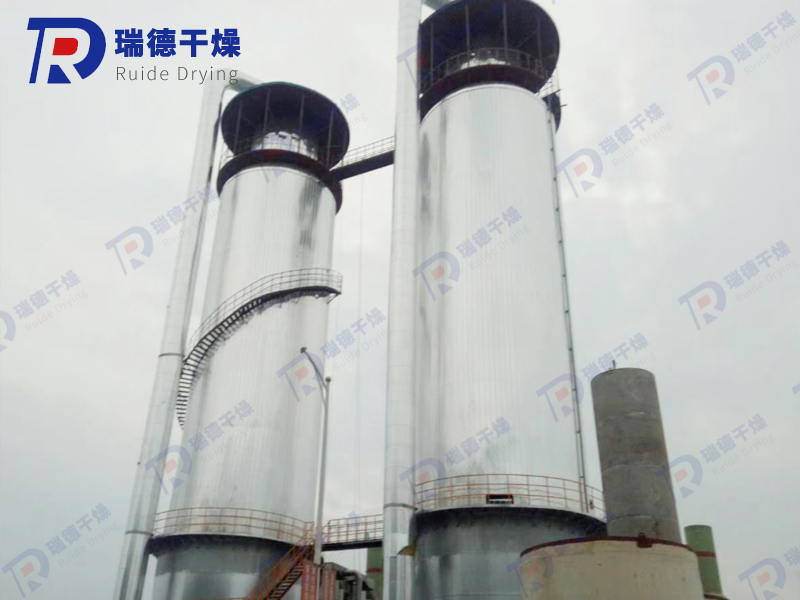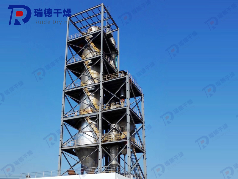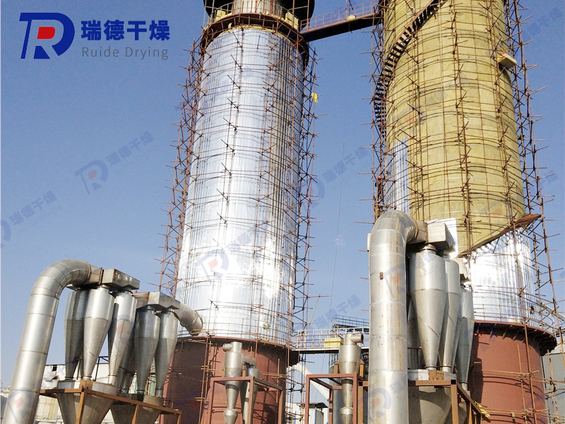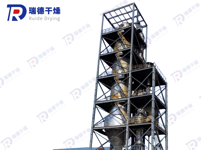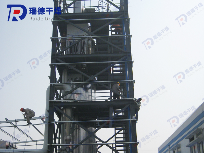 料液通過隔膜泵高壓輸入,噴出霧狀液滴,然后同熱空氣并流下降,大部分粉粒由塔底排料口收集,廢氣及其微小粉末經旋風分離器分離,廢氣由抽風機排出,粉末由設在旋風分離器下端的授粉筒收集,風機出口還可裝備二級除塵裝置,回收率在96-98%以上。